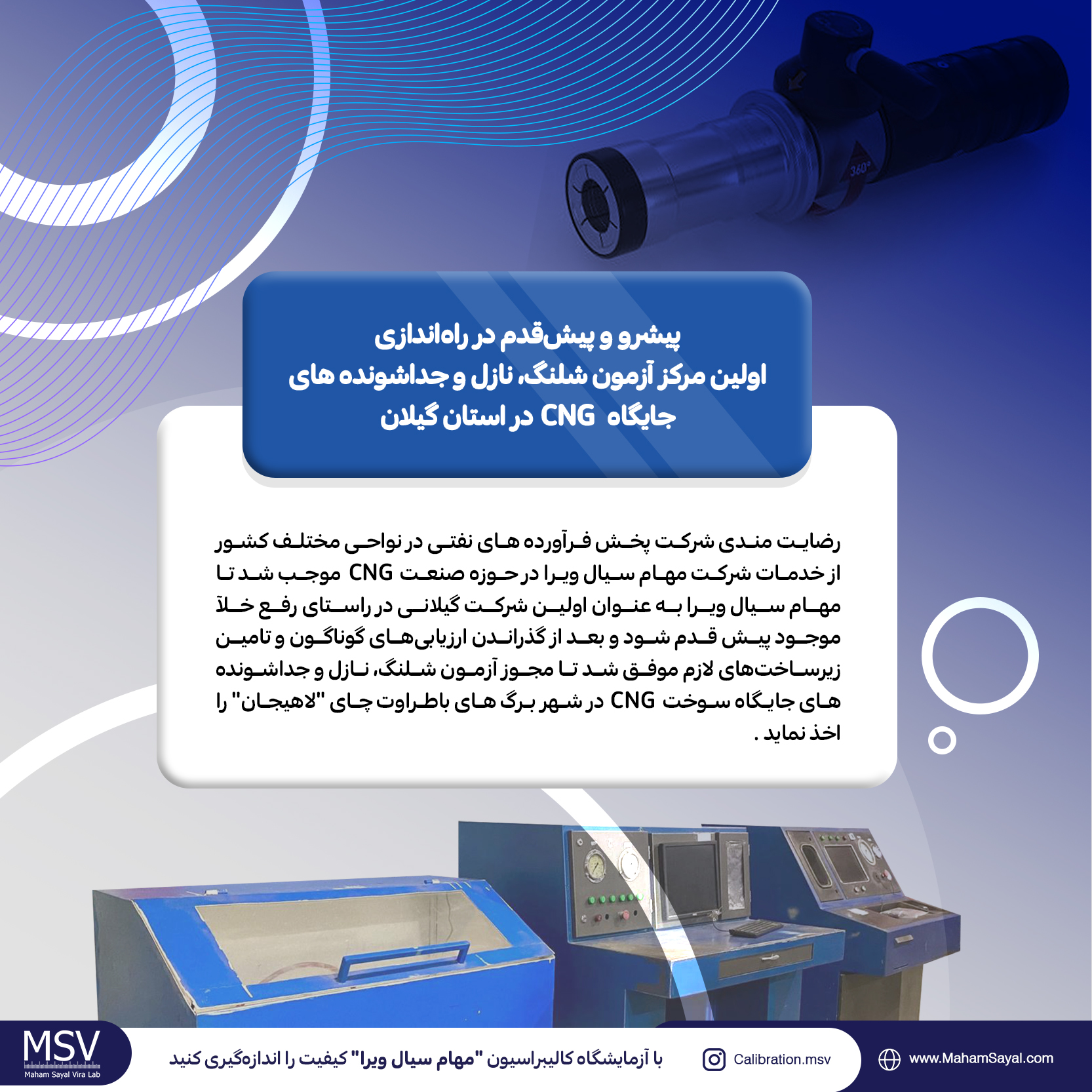 در راستای پیشبرد اهداف مصوب و بلند مدت هیات مدیره مهام سیال ویرا و بعد از نیازسنجی‌های صورت گرفته ، مدیران این شرکت تصمیم به اخذ مجوز آزمون دوره‌ای شلنگ، نازل و جداشونده‌های جایگاه‌ سوخت گاز طبیعی از اداره کل استاندارد گیلان را گرفتند که در نهایت پس از انجام سرمایه‌گذاری وسیع و تآمین زیرساخت‌های مورد نیاز موفق شدند تا ارزیابی‌های مربوطه توسط کارشناسان استاندارد در یک سال گذشته را با موفقیت طی نماید و به این ترتیب خلا موجود در این حوزه را برای فعالان صنعت CNG پوشش بدهد.