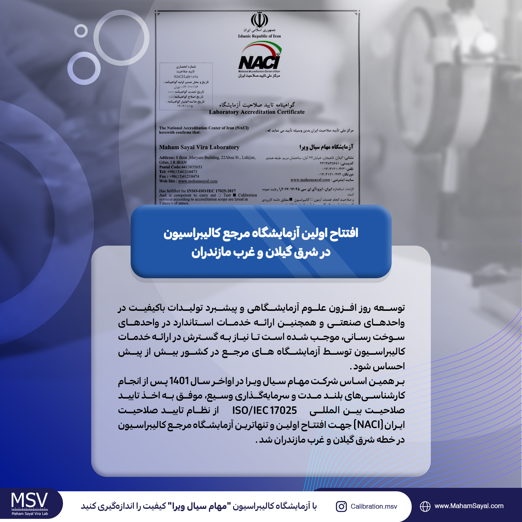 توسعه روز افزون علوم آزمایشگاهی و پیشبرد تولیدات باکیفیت در واحدهای صنعتی و همچنین ارائه خدمات استاندارد در واحدهای سوخت رسانی، موجب شده است تا نیاز به گسترش در ارائه خدمات کالیبراسیون توسط آزمایشگاه های مرجع در کشور بیش از پیش احساس شود. بر همین اساس شرکت مهام سیال ویرا با افتخار اعلام می دارد؛ پس از انجام کارشناسیهای بلند مدت و صرف هزینههای بسیار، این شرکت موفق به اخذ تایید صلاحیت بین المللی ISO/IEC 17025 از نظام تایید صلاحیت ملی ایران (NACI) جهت افتتاح آزمایشگاه مرجع کالیبراسیون مهام سیال ویرا شد.